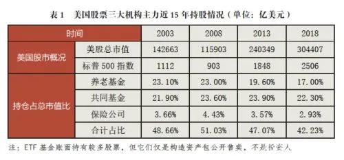 表1中,我们按持股占比列出三大美股机构主力的投资地位,养老基金、共同基金和保险公司这三家都是长期资本,近15年合计占美股总市值最高达到了51%,保险公司持股仅在3%左右,已经比养老基金和共同基金持股规模小了一个量级,再往下就不算是影响美股的机构投资者了。值得注意的是,2008年后三家持股占总市值比例都出现了下降。