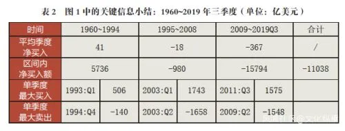到1995年至2008年这个阶段,虽然没有明显的净卖出(总计仅卖出980亿美元),但买卖力度加大了,单季度最大买卖从前35年最高(1993年一季度)的几百亿美元一下增加了一个量级达到了接近两千亿美元。到了次贷危机后,从2009年到2019年十年时间累计卖出股票近1.6万亿美元,其间仅仅在两三个季度中出现过净买入。这种大规模抛售使其从1960年至今的60年时间内,累计对美股的投资额变成了净卖出1.1万亿美元。十年内把美国股市兑现为提款机。