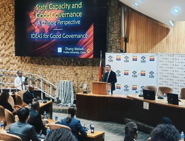 2025年二十国集团(G20)领导人峰会举行在即,国家高端智库理事会理事、复旦大学中国研究院院长张维为教授应邀访问南非。8月25日上午,张维为教授出席南非“二十国集团智库研讨会”(T20 Symposium)并发表主旨演讲。研讨会由南非国家行政学院与南非大学联合主办,主题为“复杂时代下的国家能力与制度转型:构建敏捷型公共机构”。南非全球对话研究所所长费拉尼·穆坦布(Philani Mthembu)主持研讨会,南非国家行政学院代理校长菲迪勒·姆克瓦纳齐(Phindile Mkwanazi) 致开幕辞。来自中国、俄罗斯、南非等国家的知名学者、政府官员、政策专家出席了研讨会。