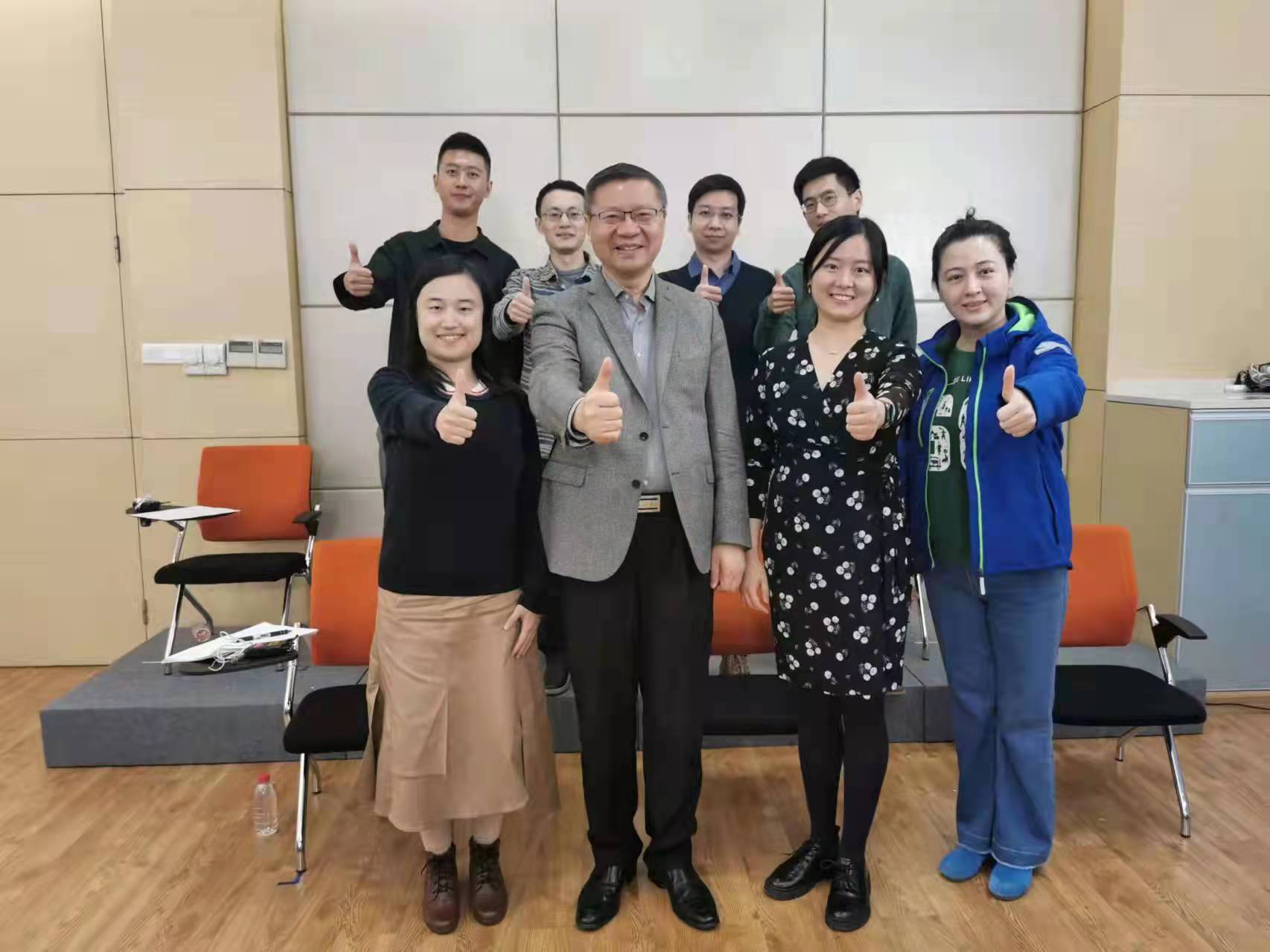 图为中国研究院院长张维为(左二)、党政办公室主任胡冰(右一)及六名学生代表
