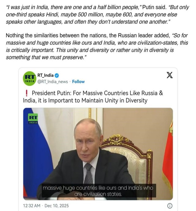 尽管存在如此巨大的语言隔阂,普京强调,印度依然保持了高度的国家统一。他指出:“对于像我们(俄罗斯)和印度这样幅员辽阔的‘文明型国家’而言,这一点至关重要。这种‘多元一体’是我们必须共同维护的宝贵特质。”