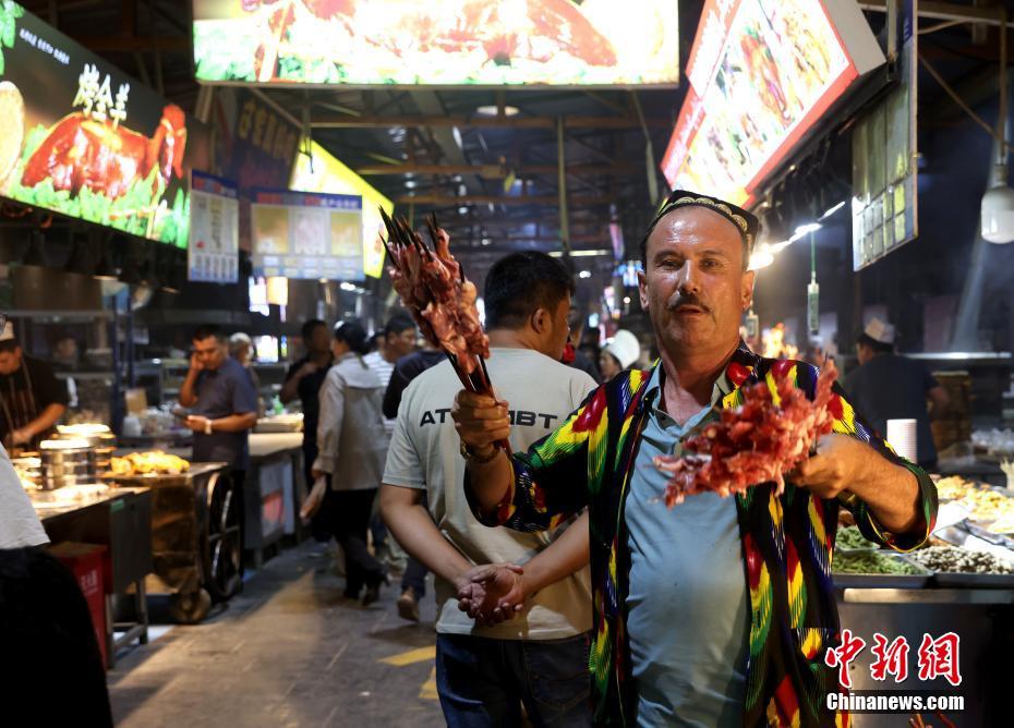 新疆阿克苏老街夜市上,民族歌舞表演、特色美食吸引市民和游客光顾,夜市摊主推荐美食羊肉串。图自中新网