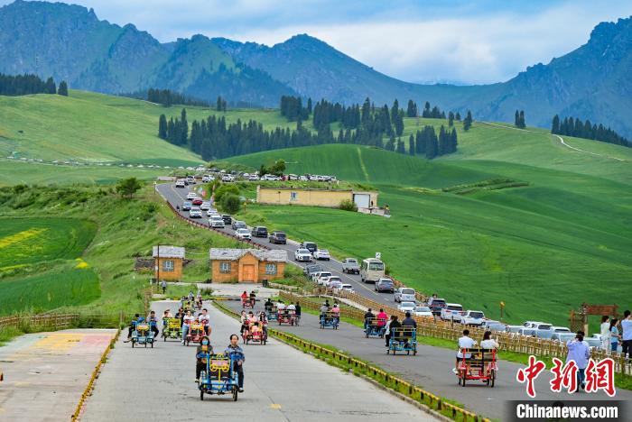 国家5A级旅游景区江布拉克景区内车流如织。图自中新网 陶维明 摄
