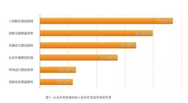 在多元时代和复杂社会生态下有效凝心聚力、增强国家认同,离不开核心意识的进一步强化。坚强有力的领导核心是中国特色社会主义制度的重大优势。当问及受访者:“身处多元化的时代,如果这个国家的公众具有很强的核心意识,那么将给整个国家带来什么?”调查显示,“人民群众更加团结”为75.00%的受访者所选择。还分别有63.66%、54.30%、43.84%的受访者选择了“国家治理更富效率”“发展动力更加强劲”“社会环境更加和谐”。此外,“市场运行更加有序”(20.26%)、“创新体系更富弹性”(18.50%),也为部分受访者所选择。