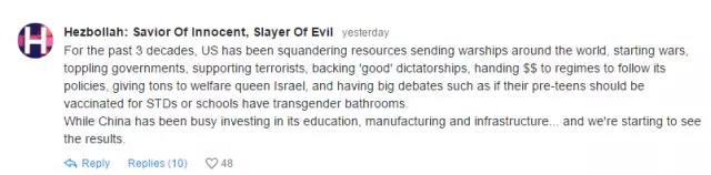 同样的,美国人当中也不乏“愤青”。其中有人评价道:过去的30多年间,美国忙于在全球打仗,支持恐怖主义,为“跟随美国”的政权撒钱,忙于争论是否该有性病疫苗,忙于争论学校是否该有男女混用卫生间。这时候中国在干嘛?他们忙于投资自己的教育、制造业和基础设施。