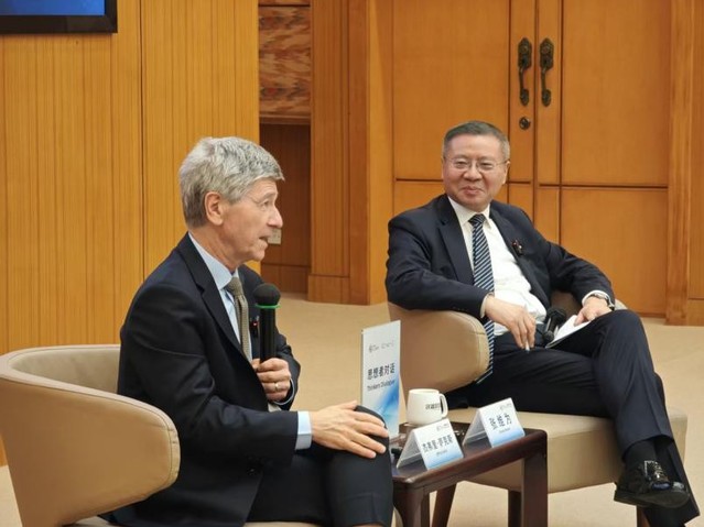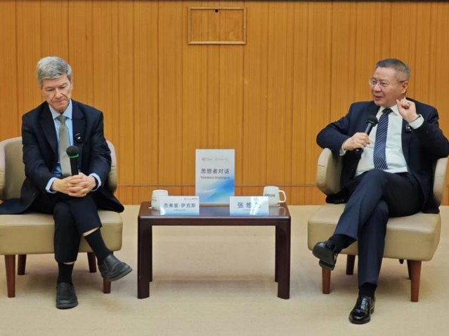 演讲结束后,张维为教授与萨克斯教授围绕新能源与全球秩序变革、中日关系等议题进行了对话。张维为教授回顾了2018年在哈佛大学肯尼迪政府学院的演讲,曾提出“中国领导人拥抱2050年,而美国特朗普拥抱1950年”的观点。他指出,现在特朗普更是退回到了1850年代的门罗主义。从能源视角看,英国基于煤炭,美国主导秩序依赖石油等传统能源,而中国如今在新能源领域处于领先地位,正在塑造以可再生能源为基础的多极世界秩序。萨克斯教授表示,新能源秩序的核心是摆脱化石燃料以应对气候变化,这对全球水资源、粮食安全、公共卫生等至关重要。特朗普政府执着于煤炭、石油等传统能源,退出《巴黎协定》、取消国内可再生能源项目,反而为中国成为绿色技术全球领导者创造了机遇。