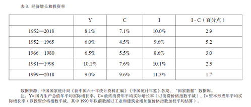 生产率进步的直接推动力是生产性投资,而资本深化或重工业优先的工业化路径,是1978年之前占主导的发展战略,在改革开放年代也有明显的体现。在1952-2018年期间,整体经济的总支出、总消费和总投资的实际年平均增长率分别是8.1%、7.1%和10.0%,投资增长显著领先于消费增长。分时段看,三者在1952-1978年期间分别是6.1%、4.7%和9.4%,在1978-2018年期间分别是9.4%、8.7%和10.4%;显然,投资增长领先在1978年之前确实是主导,在改革开放年代这种领先也持续下来。再就国际比较看,从上文表1可见,在1960-1980年期间,中国的投资率跟发展中世界的平均数持平(并略高于发达国家),至1981-2017年更是远超后者,这个对比反映了中国的发展战略和实际发展路径的特性。