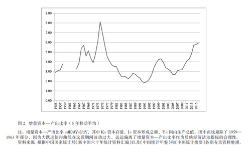 至于改革开放年代之前的情况,虽然有上述的指标涵义不确定问题,但在剔除了大跃进导致投资率和生产性效率暴起暴落的干扰因素之后,大致上还是能够看出,总体趋势是资本— 产出比率快速攀升、资本深化快速推进。这个趋势不仅见于自1950年代初期至1960年代中期的中央计划主导时段,也见于1960年代中期至1970年代末期的权力下放、分散计划时段,甚至正是在这后一时段中,增量资本— 产出比率被推高至前所未有的水平。