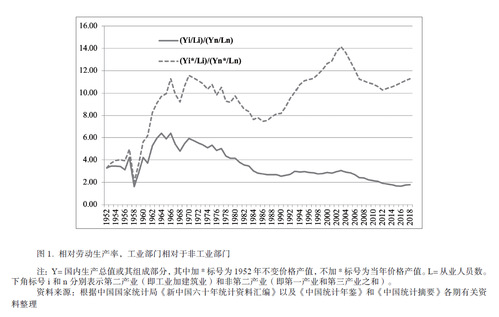 纵观新中国成立后的近70年,中国的工业化持续快速推进。在1952-2018年期间,国内生产总值和工业增加值的年平均增长率,分别是8.1%和10.8%,后者显著领先于前者。这种对比不仅见于1952-1978年期间,也见于1978-2018年的改革开放年代。从实现现代化目标的角度看,图1显示工业部门与非工业部门的相对劳动生产率,从中可见:一是在近70年的整个时段中,工业部门以固定价格(不变价格)计算的相对劳动生产率趋于上升,反映了工业部门的生产率进步快于非工业部门;二是以固定价格计算的相对劳动生产率曲线显著高于以当年价格计算的相对劳动生产率曲线,而且两条曲线的差距愈趋扩大,意味着工业部门的生产率进步成果通过价格机制转移到非工业部门,带动整体经济增长。