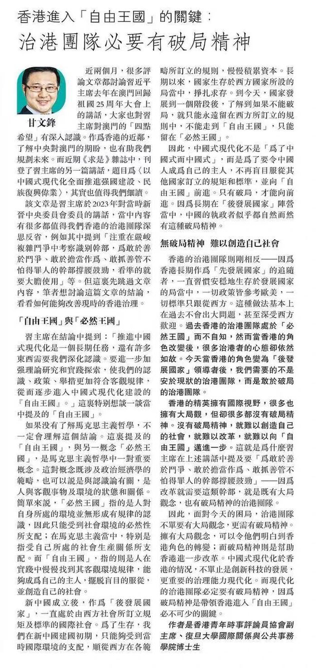 因此,面对今天的困局,治港团队不单要有大局观念,更需有破局精神。拥有大局观念,可以令他们明白到香港角色的转变;而破局精神则是帮助香港进一步改革。中国式现代化于香港的情况,不单止是创新科技的发展,更重要的治理能力现代化。而现代化的治港团队必定要有破局精神,因为破局精神是带领香港进入“自由王国”必不可少的关键。