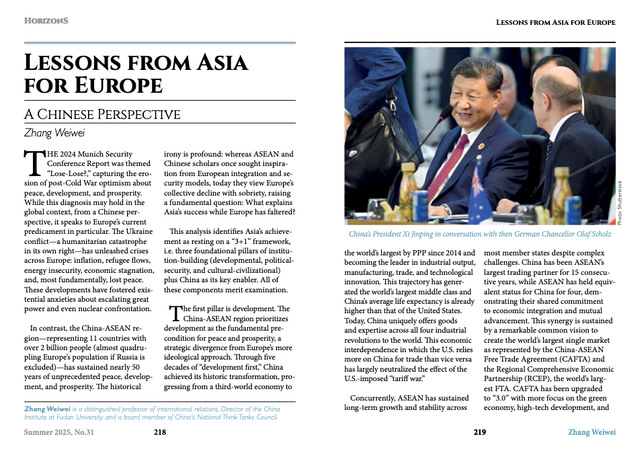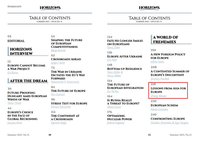 欧洲知名期刊《地平线》(Horizons)2025年夏季刊刊发了复旦大学中国研究院院长张维为教授的论文《中国视角下亚洲对欧洲的启示》(“Lessons from Asia for Europe:A Chinese Perspective”)。