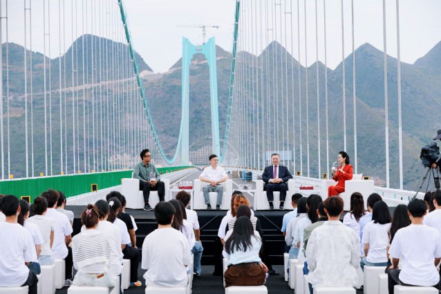 录制当日,大桥桥面准备工作井然有序,场景布置精致,设备调试精准,人员协调高效,为节目营造了良好的录制环境。录制过程中,嘉宾们围坐交流,深入探讨中国基建成就与民生发展的紧密关联,分享花江峡谷大桥建设故事及其对区域发展和人民生活的深远影响。现场观众热情参与、积极提问,与嘉宾展开互动,让中国基建故事在交流中更具感染力与传播力。