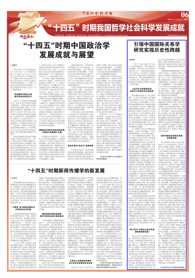 “十四五”时期,我国哲学社会科学界立足中华民族伟大复兴战略全局,扎根中国大地做学问,围绕构建中国特色哲学社会科学三大体系与自主知识体系,取得丰硕成果。中国社会科学杂志社推出特别策划,聚焦五年来我国哲学社会科学的理论创新成就,展现哲学社会科学工作者服务中国式现代化的思想力量与学术担当。