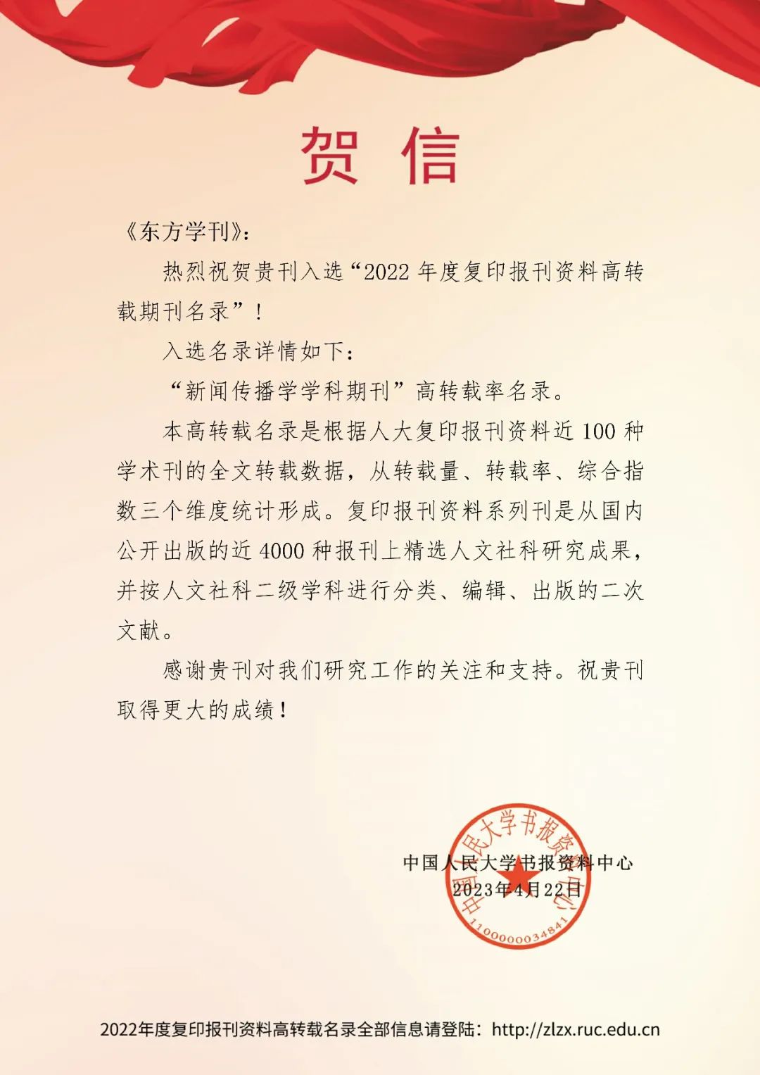 2023年4月22日,“中国人民大学复印报刊资料转载名录发布论坛暨中国自主知识体系建构与学术期刊发展研讨会”正式发布2022年度复印报刊资料高转载期刊名录。《东方学刊》入选“2022年度复印报刊资料高转载期刊名录”,入选名录详情为“新闻传播学学科期刊”高转载率名录。