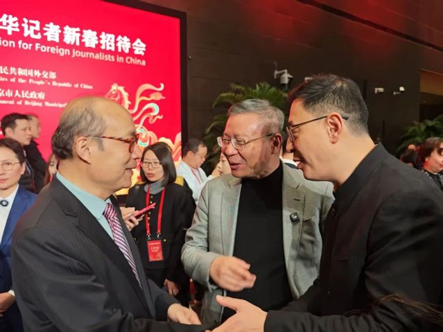 洪磊部长助理、陈旭会长与张维为教授、范勇鹏研究员亲切交谈。张教授还与《今日俄罗斯》、彭博社、法新社等外国媒体和新闻社驻华记者亲切交流,并回答了他们提出的不少问题。