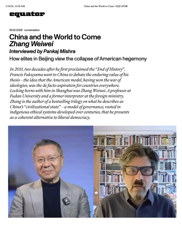 2月16日,英国Equator杂志刊发了印度知名作家潘卡杰·米什拉对复旦大学中国研究院院长张维为教授的专访,并在编者按中写道: