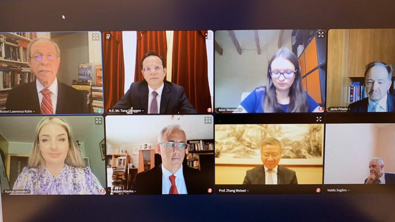 拉脱维亚大学人文学院Kaspars Klavins教授主持了研讨会,中国驻拉脱维亚大使唐松根致辞,热烈祝贺研讨会的举办。复旦大学特聘教授、中国研究院院长张维为通过视频为研讨会做了题为“中国式现代化模式与中国新发展理念”的主旨发言。