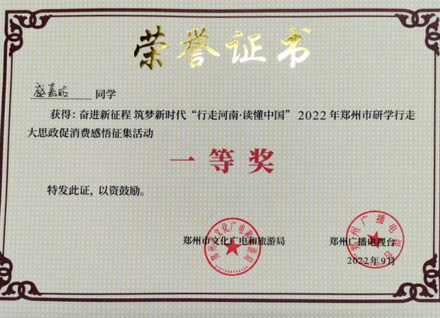 同时,在暑期社会实践期间,盛嘉昭同学参加新华社河南分社实习,郑州市人民政府暑期主办的“行走河南读懂中国”研学活动,共青团河南省委主办的“创赢未来·优秀大学生中原行暑期夏令营”活动等,借助各大平台,不断完善项目和拓展视野。